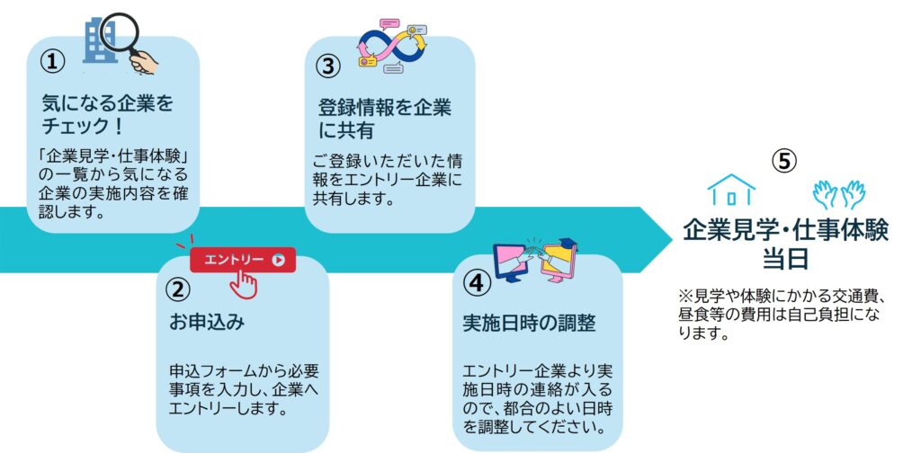 ※「企業見学・仕事体験」後、企業へ応募される場合は、ご自身で企業とやりとりをお願いします。